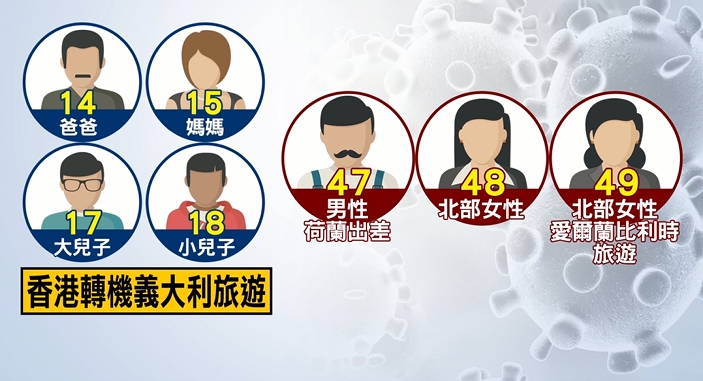 指揮中心研判,她在國外感染可能性較高,不只49例,最早是14、15、17、18例,一家四口,從香港轉機到義大利旅遊,其中小兒子確診時沒有症狀,再來是案47的男性,他是到荷蘭出差,案48北部女性是到英國旅遊,再加上案49到愛爾蘭、比利時旅遊。