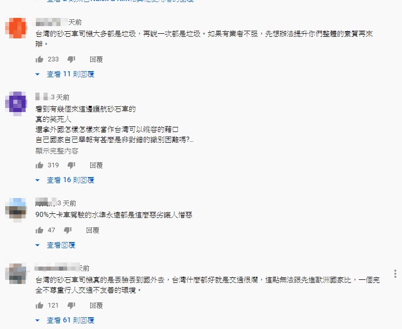 過程中,Naick氣到狂按喇叭長達5秒,他傻眼表示「卡車越開越近,都快貼到我保險桿了」,也解釋2台車原本都在同一條路上,但卡車似乎想超車,一直逼近他們,最後直接從另一條車道超車,沒想到事情發生沒多久,他們又遇到另一輛卡車逼車,接連2次的驚險經歷讓他們直呼「真的很危險」,許多網友也表示「砂石車司機真的丟臉丟到國外」、「記得路上遠離砂石車,他們會逼車」,紛紛批評那些危險駕駛。