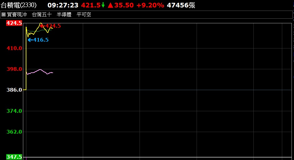 焦點股中,台積電跳空大漲9%,一度打到漲停價位,相關概念股帆宣、弘塑、閎康、萬潤、家登一起歡慶;晶圓二哥聯電今天也沒有休息、上漲4.3%,另外一座神山聯發科也同漲4%左右,帶動IC設計股祥碩、世芯等表現。韓國大廠LGD報喜,友達、群創漲逾2%。
