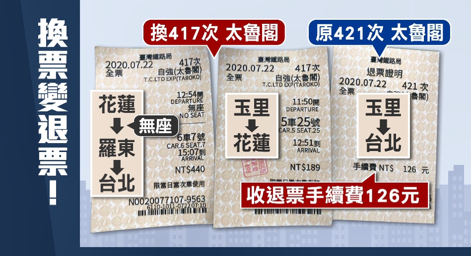 台鐵解釋,換票是起訖點相同才叫換票,但為了幫乘客找到座位作業上是先退票,再訂2張3段票,按台鐵退票制度,當天退票得扣票價20%,票價629元因此收手續費126元,當事人後來也接受配合。