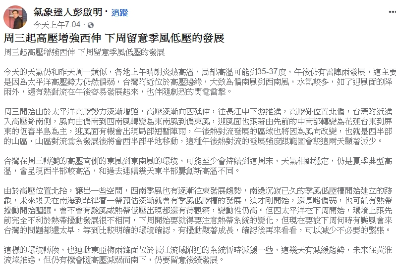 ▼彭啟明透露,未來幾天內將會有季風低壓槽的發展。(圖/翻攝自臉書氣象達人彭啟明)