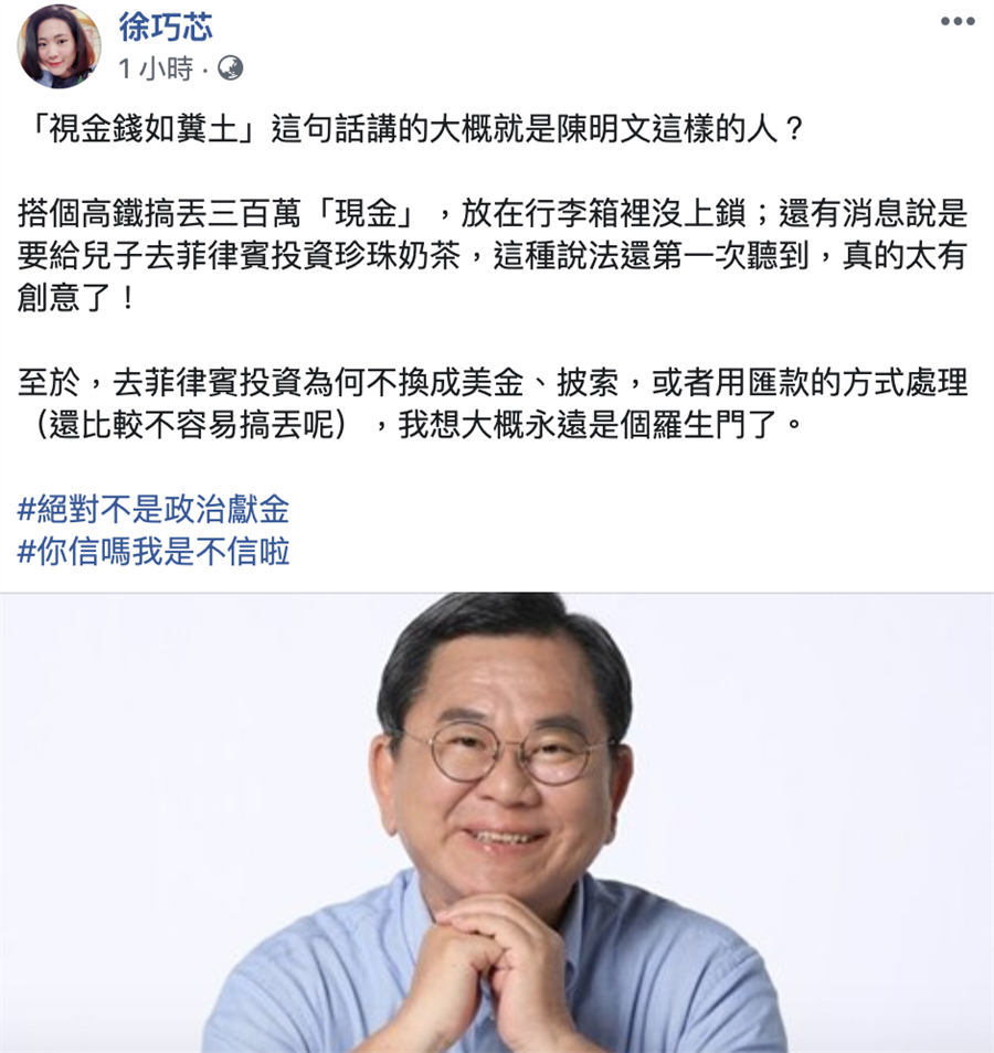 對此,國民黨台北市議員徐巧芯在臉書稱陳明文「視金錢如糞土」,如果是去菲投資,為何不換成美金、披索或用匯款方式處理,「絕對不是政治獻金」、「你信嗎我是不信啦」。謝寒冰則在臉書批,陳明文搭高鐵運送300萬現金,要給兒子去菲律賓開珍奶店,但其實臨櫃轉帳匯款手續費才40元,陳選擇親自運送卻又忘記將登機箱上鎖,可能是家裡錢太多又或是有失智症徵兆,也譏諷「現在知道民進黨的金流為什麼這麼難查了吧?」