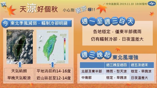氣象局預報表示,周一(11日)清晨受輻射冷卻影響,中部以北最冷,低溫探15-17度。而未來一周天氣主要都是東北風影響型態,周三(13日)白天前天氣跟今天類似,水氣較少,僅東半部有零星降雨,其他地區多是多雲到晴。氣象局進一步表示,周三前白天高溫各地都有機會到26-30度,但夜晚、清晨受到輻射冷卻影響,周一清晨中部以北、宜花低溫探15-17度,空曠地區有可能有更低溫出現,其他地區低溫則為19、20度,要注意日夜溫差大。