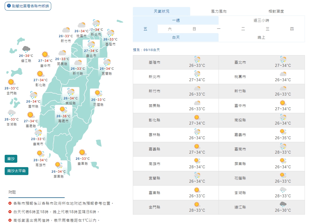 溫度部分,陳伊秀說,變動幅度不至於太大,明天各地高溫約攝氏33至35度,中午之前仍然是屬於悶熱的情況,要等到20日鋒面通過,北部及東北部會比較有涼意,低溫約22至24度之間。