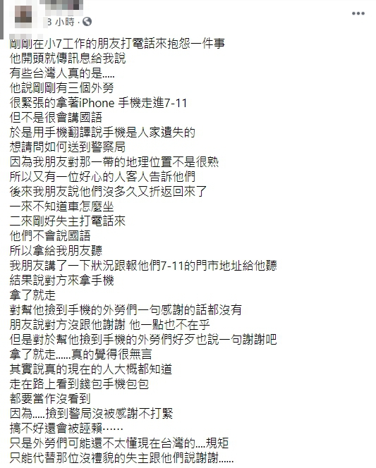「有些台灣人真的是…」近日一名在7-11工作的員工向朋友抱怨著,他表示上班的時候看到3個移工很緊張的拿著iPhone走進店裡,3人因為不太會講中文,所以用手機翻譯說明,他們撿到一支手機,想知道要怎麼送到警局,後來店裡一位客人聽到了就熱心的跟他們報路。